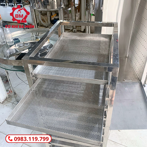 Dạng Đứng và Nhiều Tầng Khay: Tủ sấy 12 khay được thiết kế theo kiểu đứng với nhiều tầng khay, giúp tối ưu hóa không gian sử dụng trong công xưởng. Các khay được sắp xếp gọn gàng, cho phép xử lý số lượng lớn sản phẩm mà không chiếm quá nhiều diện tích.