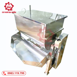 Thùng trộn hình chũ U và khi các bạn trộn xong thì tháo chốt bên hông, lật nghiêng thùng dễ dàng bằng cách cầm cây lắm trên thùng trộn, nghiêng thùng 90 độ để lấy nguyên liệu ra dễ dàng